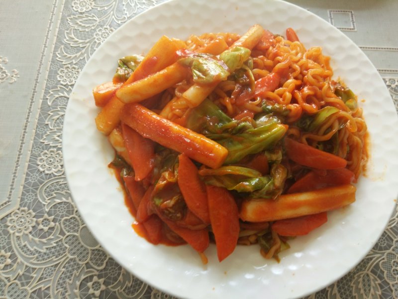 韩国拉面1袋;火锅年糕1/2袋;包菜适量;