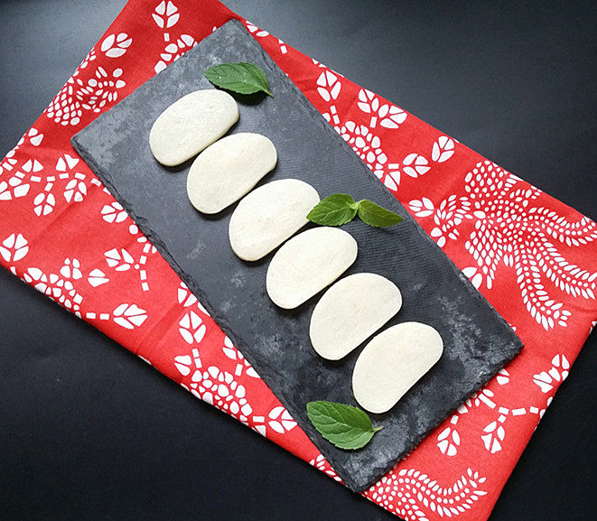 9:用刮刀将年糕从面包桶中取出放在硅胶垫上,借助保鲜膜搓成圆柱形