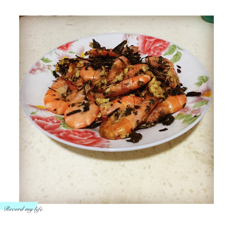 4:再次倒油进去锅中,将事先用开水泡好的茶叶滤水倒入油锅,直至茶叶变香脆,倒入刚炒好的虾,再爆炒3秒,便可起锅。
