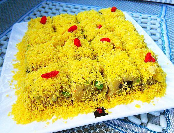 8:把蛋黄绒筛在“薯泥糕”表面。