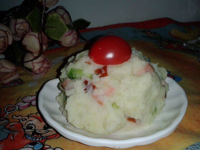 7:土豆泥装盘上桌即可,挖冰激凌的勺子或者裱花袋都可以给土豆泥塑形哦。樨儿用了挖冰激凌的勺子,最后装点了半个圣女果。