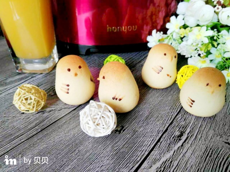 12:冷却之后,融化一些黑巧克力,用牙签沾着巧克力液画出小鸡的眼睛和羽毛纹路即可