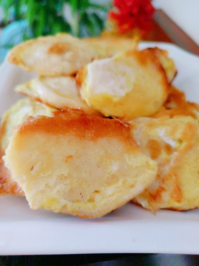 4:馒头片沾满蛋液,一片一片摆入平底锅中,全程小火,煎至一面定型。