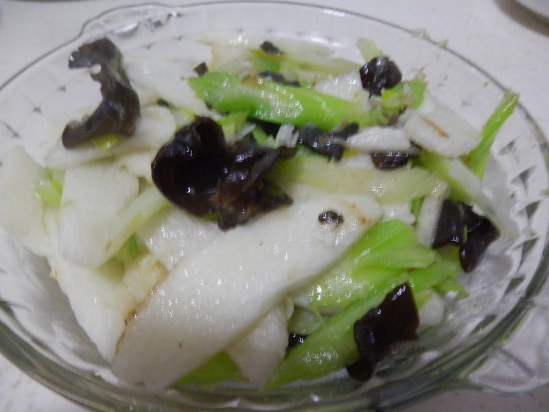 2:山药斜刀切成象眼块,西芹切成同样的块,木耳切块,葱切粒。