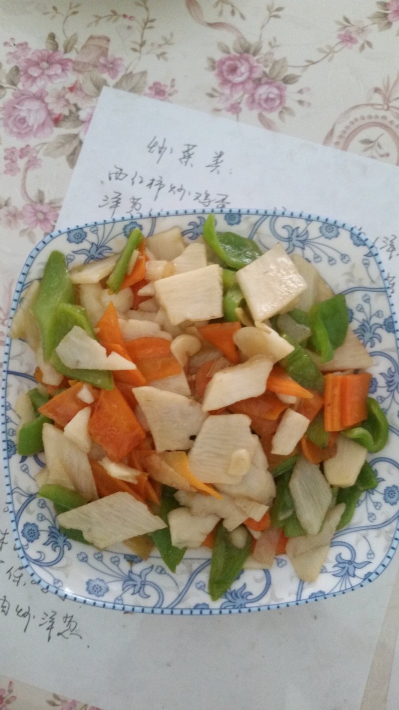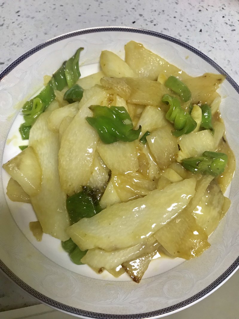 5:热锅热油,放葱花,在放山药,微炒,关火放盐,糖,起锅装盘即可