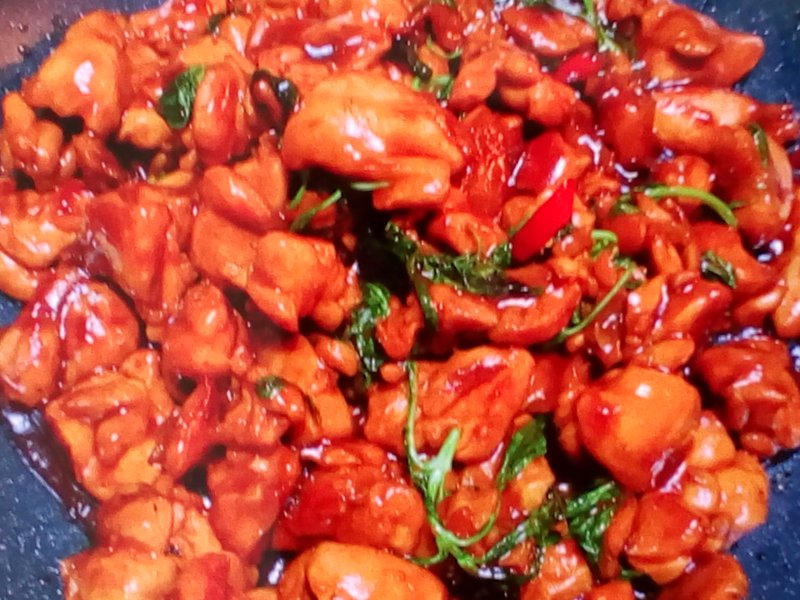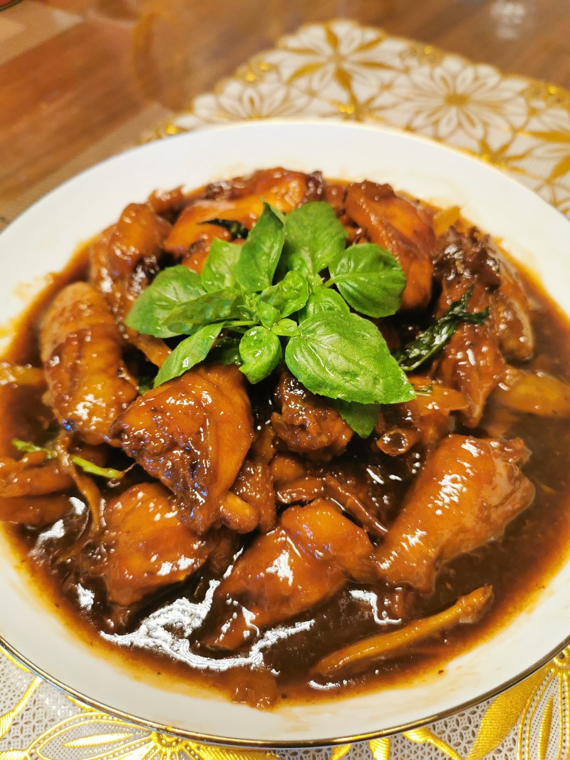 8:加入冰糖翻炒,大火焖煮,收汁后撒入九层塔翻动一下即可起锅。