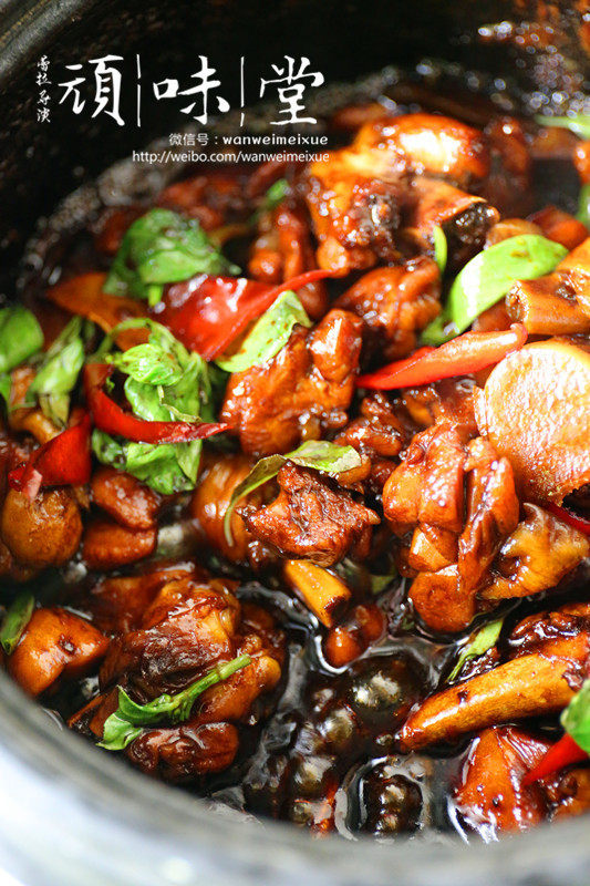 9:加盖中小火慢慢焖煮半小时左右,锅的密封性要好,不然很快就会干锅而鸡肉还没焖透;越到后面越要注意汤汁的多少和粘稠度,因为糖分较高很容易糊底哦。