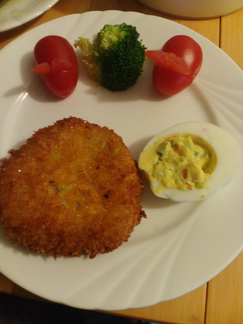 土豆2个;什锦菜50克;洋葱20克;培根3片;鸡蛋1个;淀粉2大勺;面包糠2大勺;