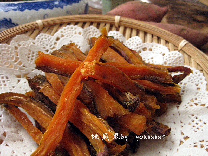 地瓜选择红心的,比较甜,北方的冬天有暖气,室内比较干燥,如果这些都不具备,可放入烤箱低温烘干。