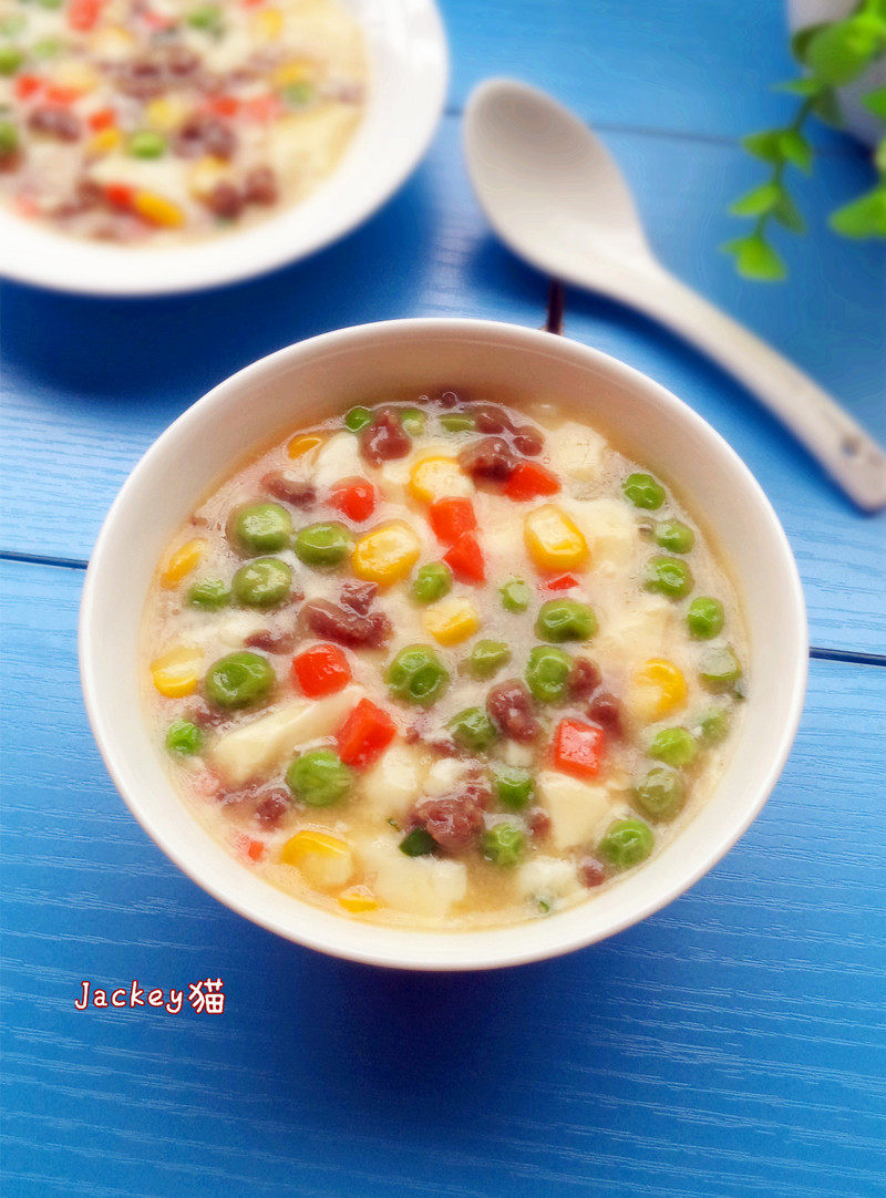 豆腐花1碗;牛肉末50克;豌豆30克;红萝卜30克;玉米粒30克;姜葱20克;