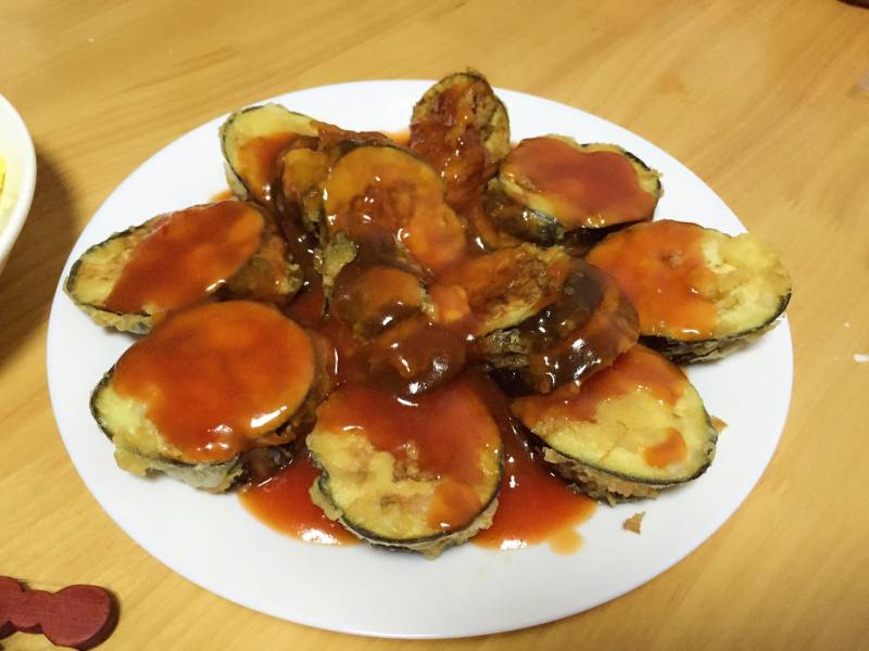 10:把做好的酸甜汁浇到茄盒子上,完成。很开胃哦~~