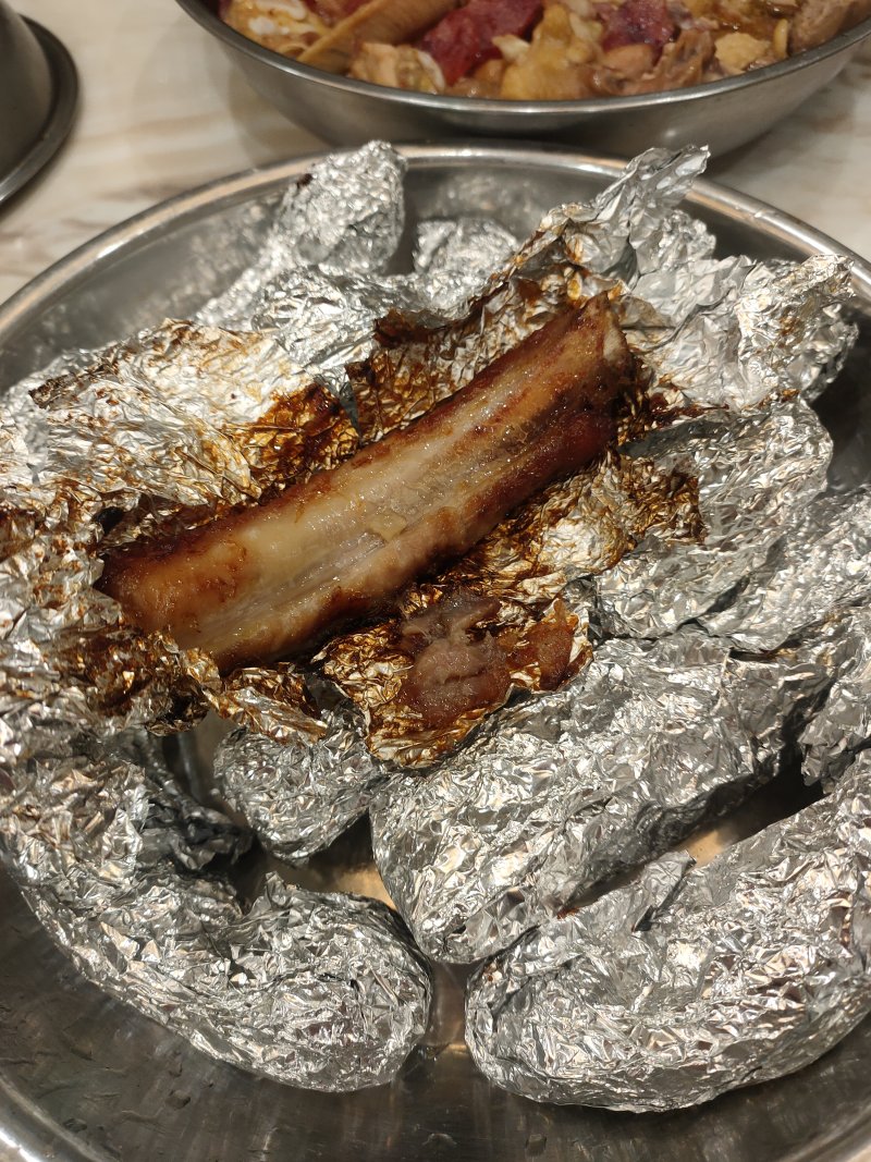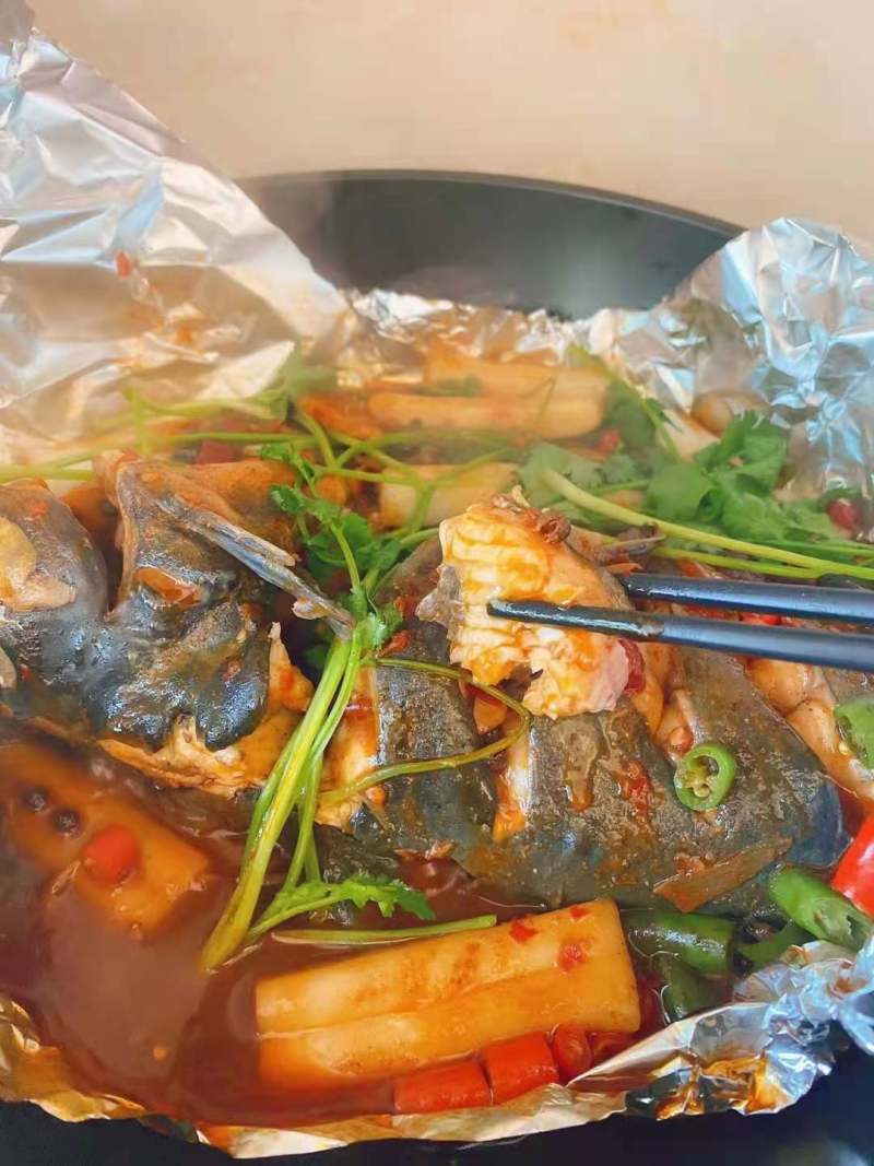 4:锡纸包裹起来盖盖子中小火烤40分钟。