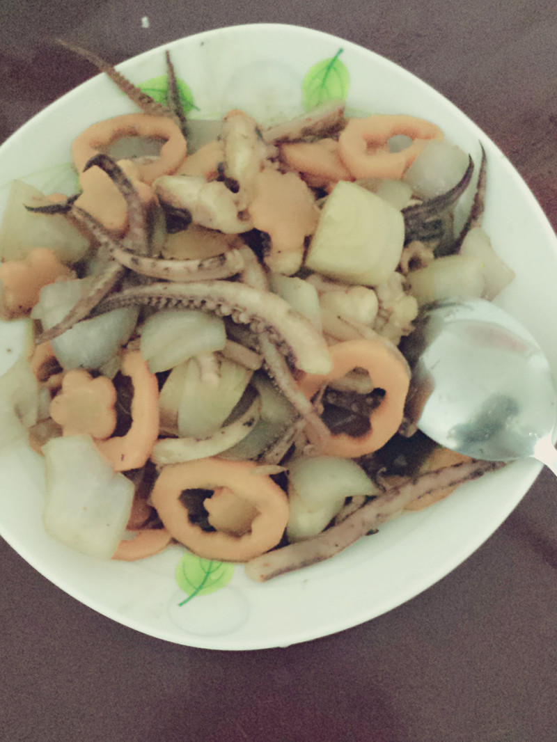 鱿鱼适量;胡萝卜一根;洋葱一个;