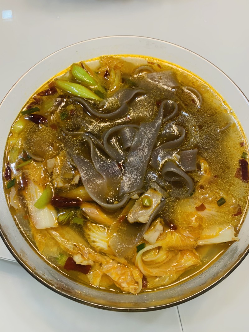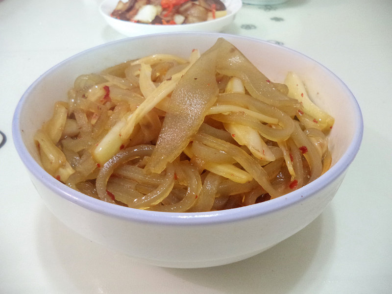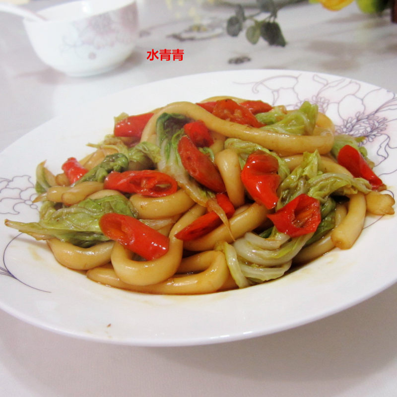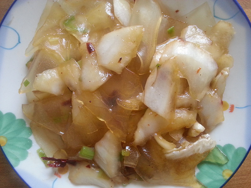粉皮经过浸泡和焯水,已经接近成熟,当白菜炒至7、8成熟时,加入粉皮,调调味就可以出锅了。干辣椒,我放得少,如果想辣味重一些,可以多加辣椒。