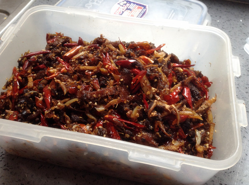 炸牛肉的时候一定要小火,以免牛肉表皮都焦了,里面还有水份。今天是第一次做给男友吃,很给面子哦。说味道好吃。我买了57元的牛肉(牛里脊肉33一斤)做出来只有这样一碗了,缩水太厉害了。伤不起啊!夏天来了,自己动手做麻辣牛肉,晚上边吃边看电视好巴适!!