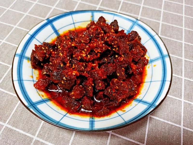 4:4.炒锅中放入适量清油(炸过牛肉的油最好),油开后,放入少许豆瓣酱进行煸炒,豆瓣炒香后将炸好的牛肉粒放入锅中翻炒,依次加入胡辣椒面,花椒面,少许白糖,适量食盐,适量鸡精,适量香芝麻粒,翻炒均匀后即可出锅!