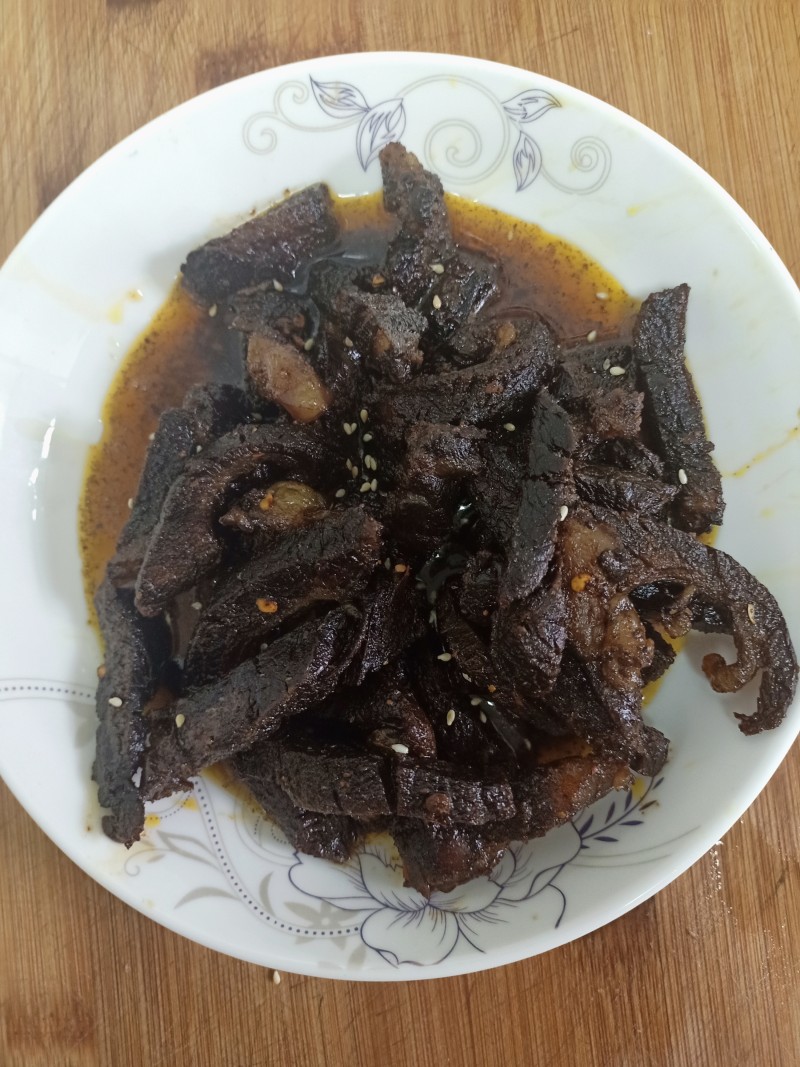 2:卤牛肉切条(事先就得切好备用,我忘记拍了),油热后倒进去煸炒