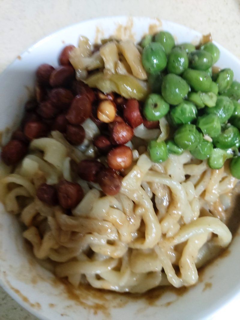 6:捞出面,拌上酱,放上豌豆,花生米,榨菜。开吃。