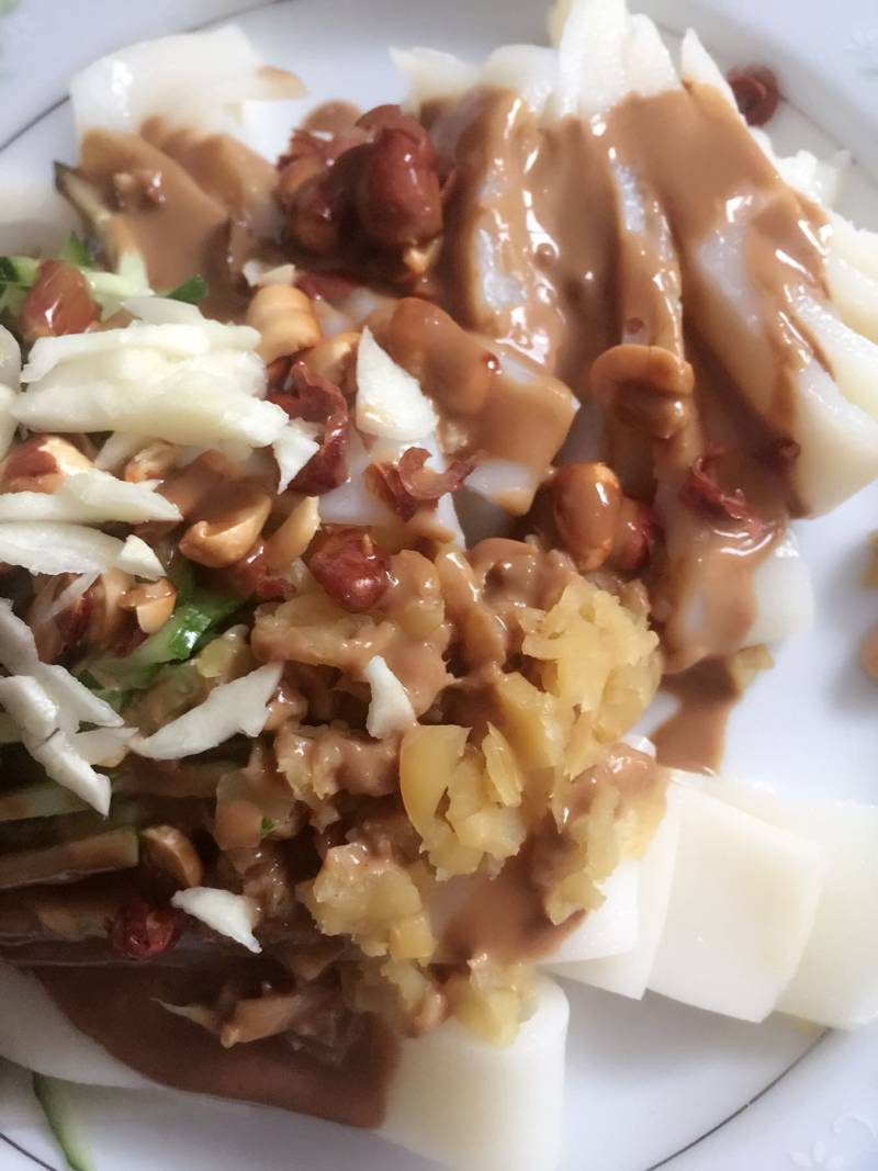 18:.将凉皮平铺在盘底,摆上各种配料,淋上花椒油、大蒜和芝麻酱做的汁、辣椒油、生抽,白糖、陈醋、香油,拌匀即可