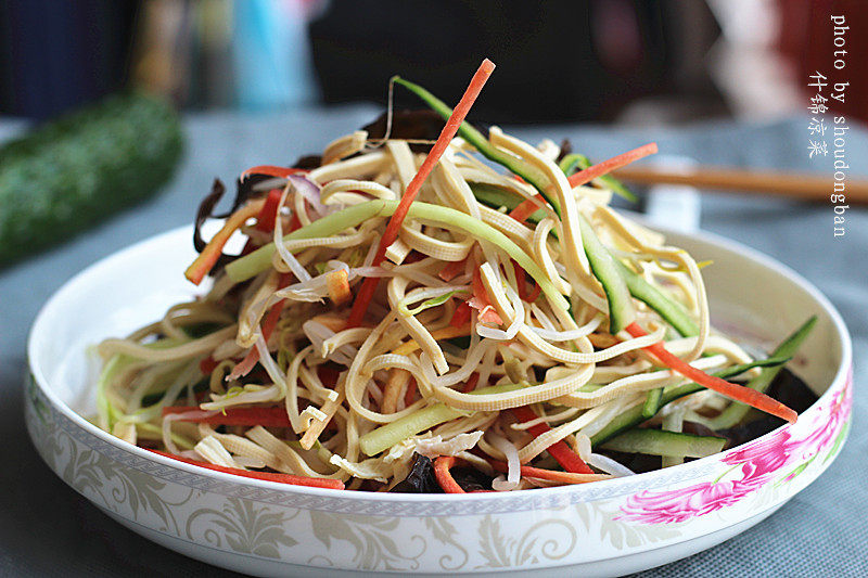 熟鸡胸肉适量;黄瓜适量;绿豆芽适量;千张适量;水发木耳适量;胡罗卜适量;