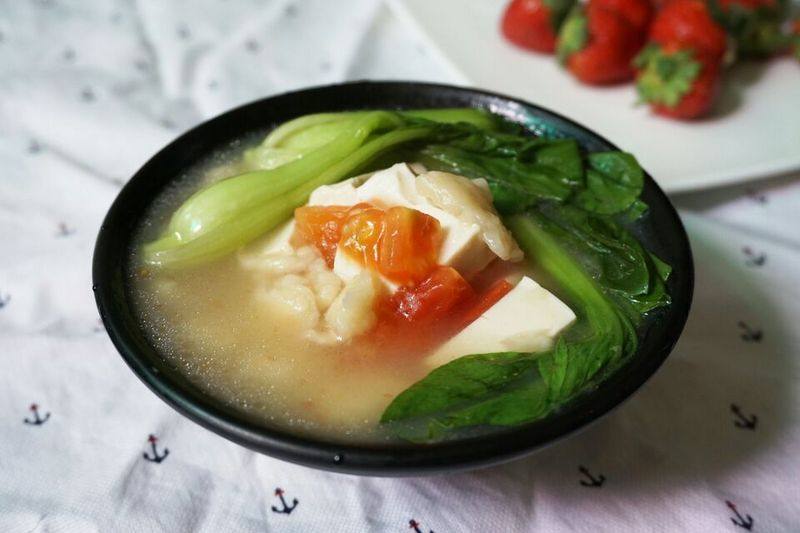 面粉适量;青菜一把;番茄一个;嫩豆腐两块;