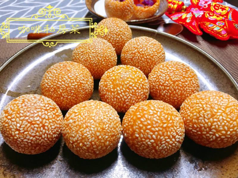 9:全部麻球都按压完毕,开大火让麻球上色,看到麻球发黄发硬可以捞出控油。如果炸得不够黄,凉了会白白的没有卖相引不起食欲,如果炸得不硬,凉了会塌窝。