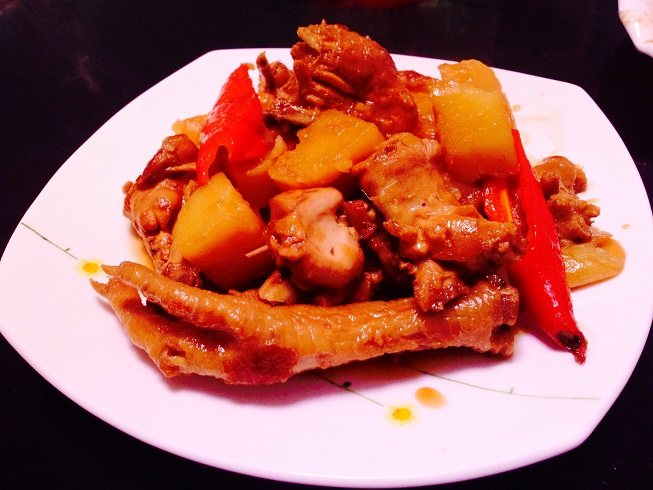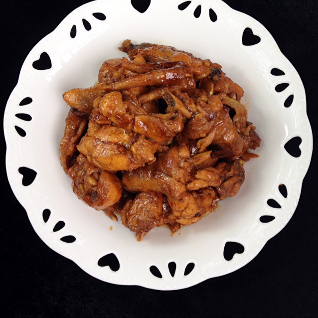 此道菜炒糖色和酱油是重点,热锅凉油放冰糖,边烧边把冰糖敲碎,熬至粘稠焦糖色立刻放鸡肉快速翻炒,炒出来的鸡颜色很好看。酱油则要根据鸡的大小斟酌生抽和老抽的多少,主要用生抽调味,用老抽提色,生抽多点少点问题不大,如果没把握到老抽时就要边倒边看,放多了菜就黑了。