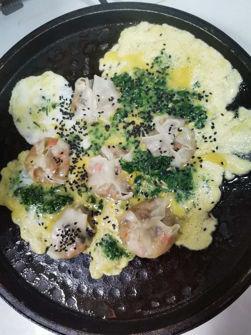 1:准备剩下的烧麦,鸡蛋,荠菜,黑芝麻。