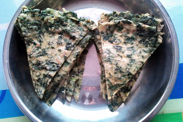 8:当底部成熟后,翻面烙,因为荠菜是熟的,所以饼很快就熟了。
