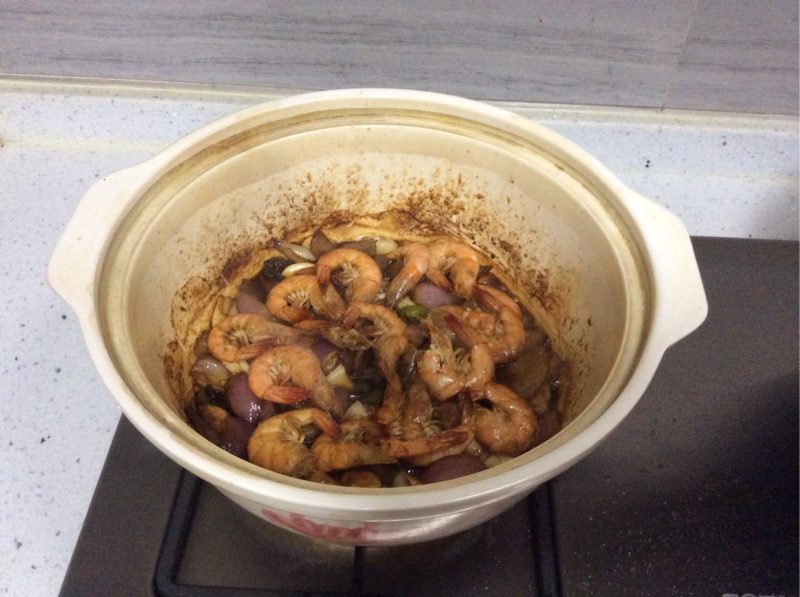 11:锅里加3勺油,还有腌虾的汤汁大火烧开小火焖烧10分钟,洒上椒盐,胡椒焖2分钟,大火烧干,上桌