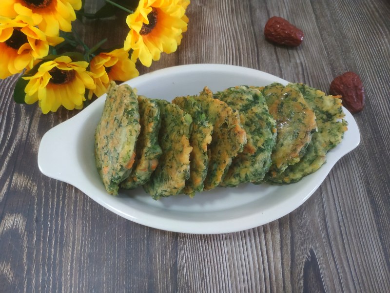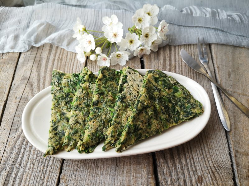 荠菜(焯水)77g;荞麦小麦粉40g;鸡蛋1个;