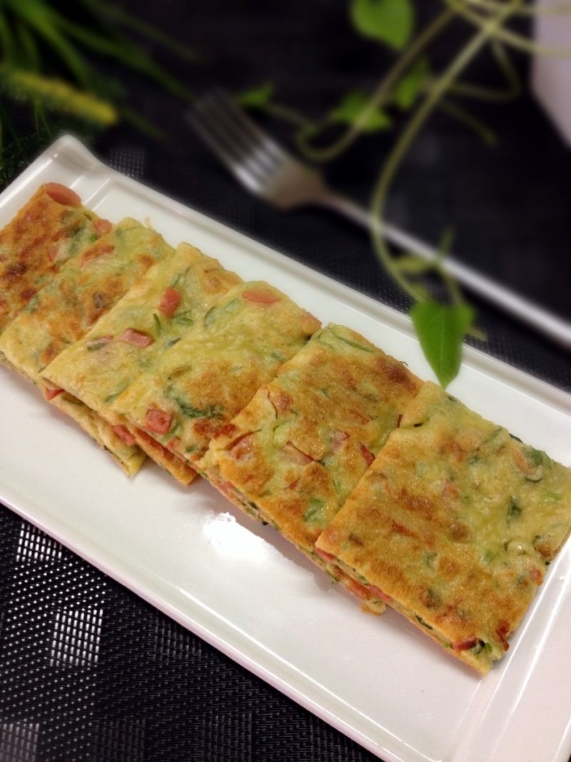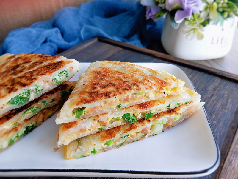 手抓饼2块;鸡蛋2个;火腿肠2根;
