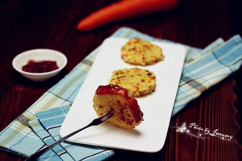 1、材料中需要放入少许生粉,可起到黏合作用,煎的时候容易成型。2、米饼可以蘸点番茄酱食用,当然这根据自己的喜好决定。3、材料中的火腿肠也可以换成培根