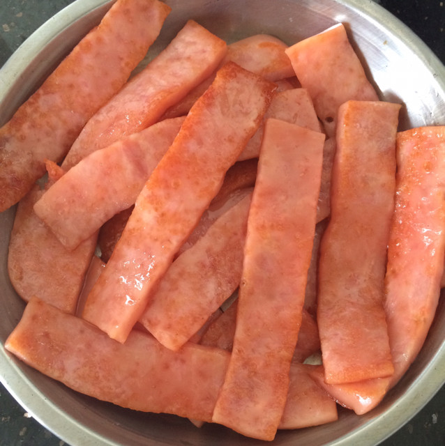 6:炒锅加少许油,把火腿丁煸至微黄冷却