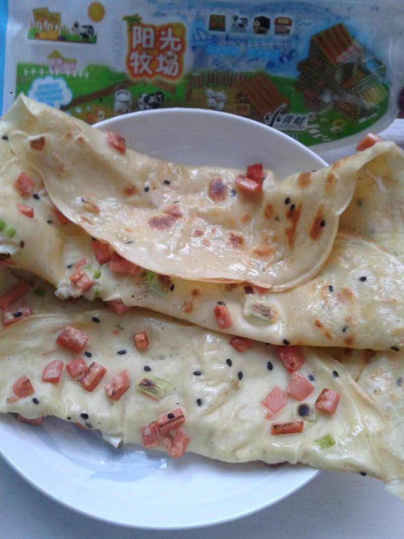 6:将火腿鸡蛋液,放入手抓饼表面。