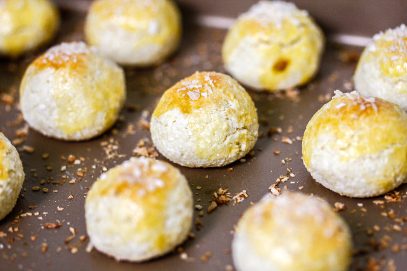 10:将所有小球放入烤盘,送进预热好的烤箱。中层,150度,25分钟左右。烤至表面呈现美丽的金黄色。烤好的椰丝球,外皮香脆、内部酥软、奶香浓郁。