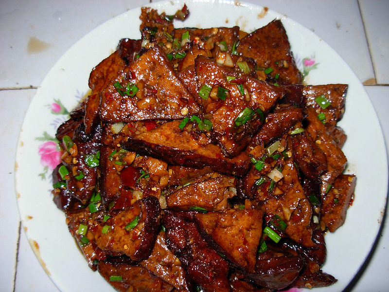 卤豆干的时候汁不要完全收干,和大蒜等调料翻炒时,这些调料的味道才能进到豆干里
