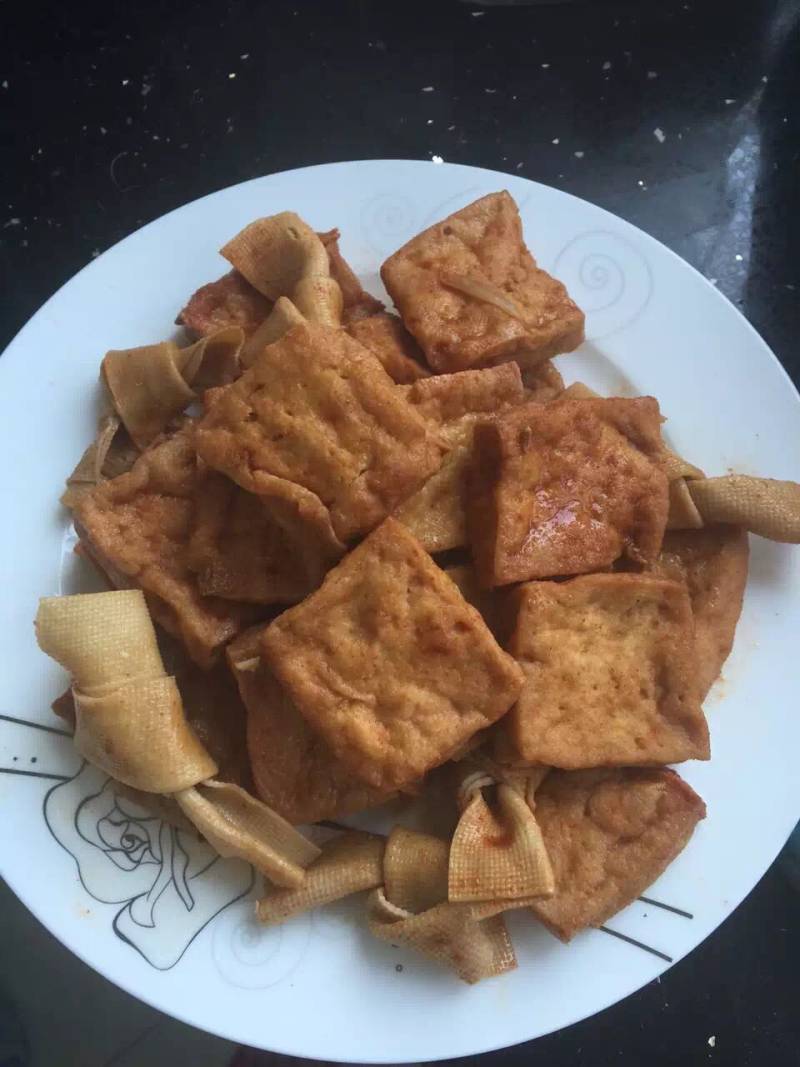 喜欢吃甜食的,可以在出锅后放点浓蜂蜜水。我觉得油豆腐比香干做出来的豆腐干要好吃,汁水多不干涩。