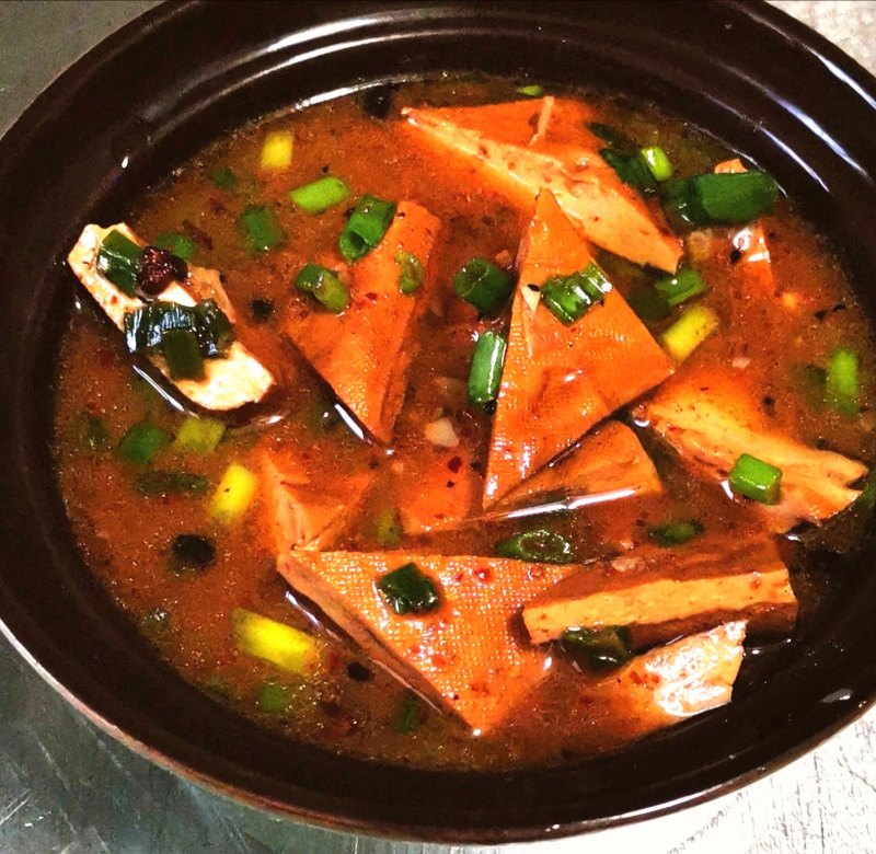 5:锅中留底油,放入花椒、大料、麻椒,干辣椒掰碎放入翻炒出香味后放有酱油、醋。略炒后加水、盐、姜片、葱段,放入豆腐,大火烧开,小水咕噜10分钟入味。