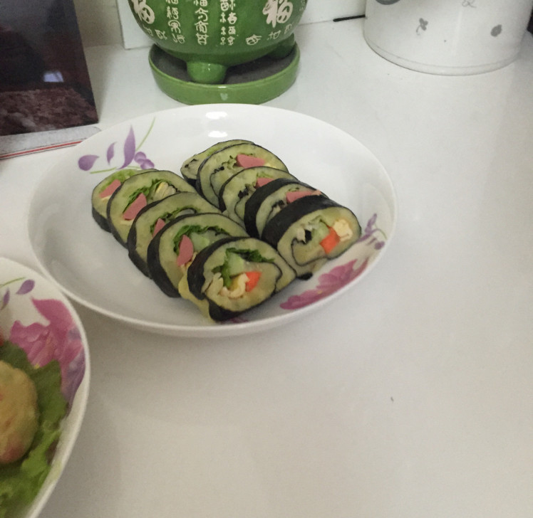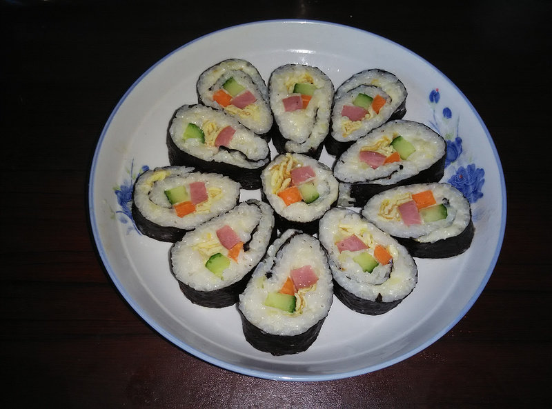 5:按照正常寿司铺好食材用卷帘卷好切开摆盘卷的时候忘记照了