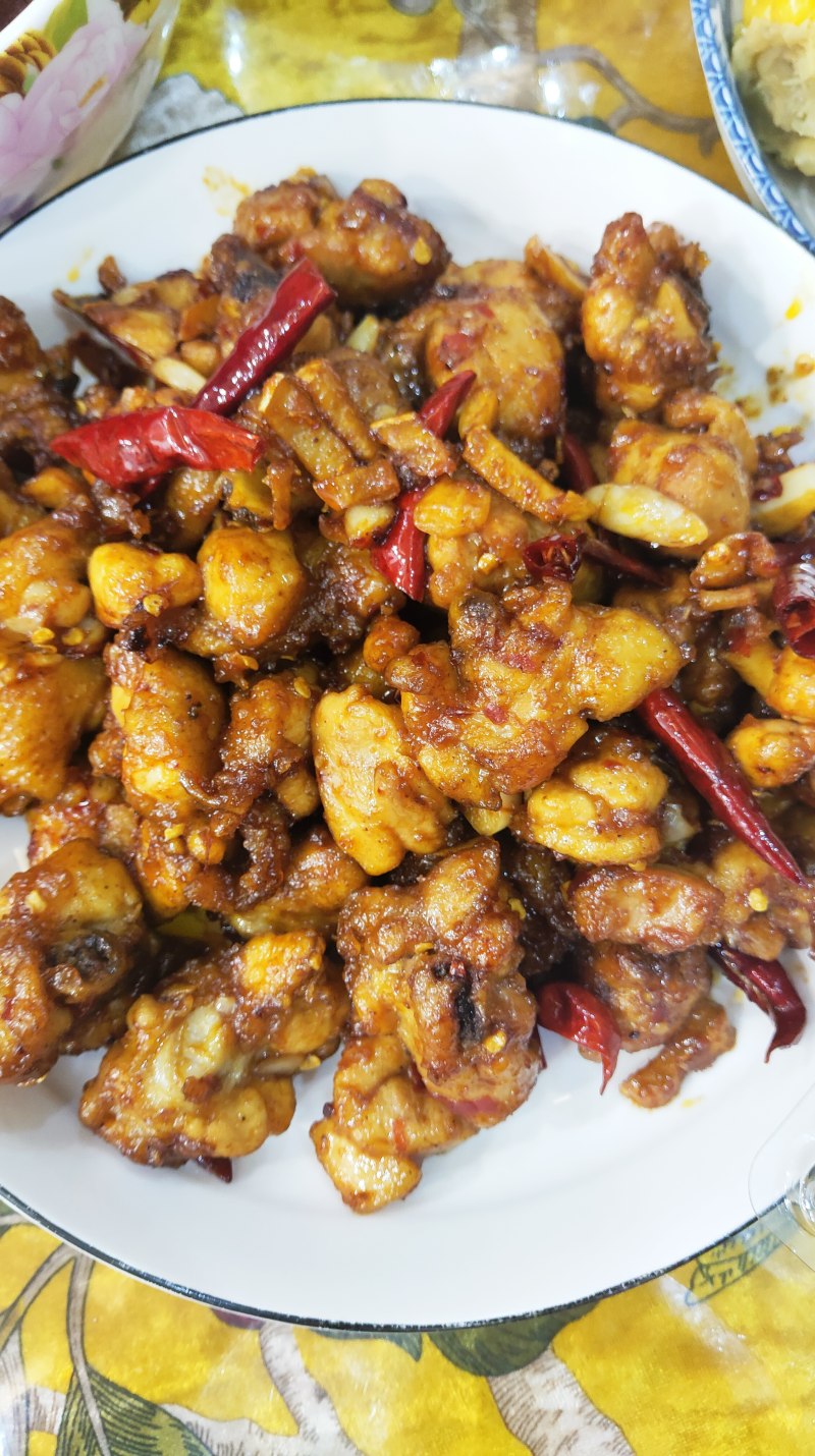 2:鸡腿加入适量玉米淀粉,起锅烧油,油温七成下过油炸,鸡腿炸外皮变硬捞出,倒出油留底油下姜,蒜,干辣椒,煸炒香味下炸好鸡块,加入盐料酒酱油,白糖翻炒几下可以出锅。
