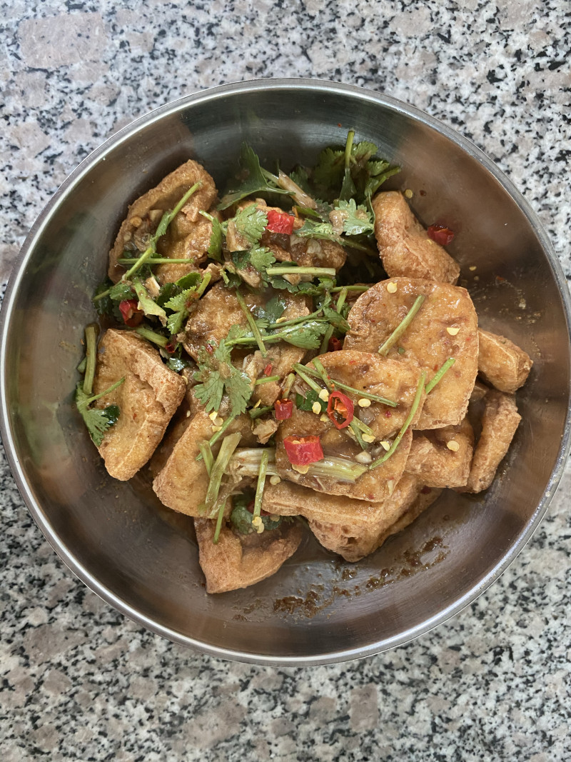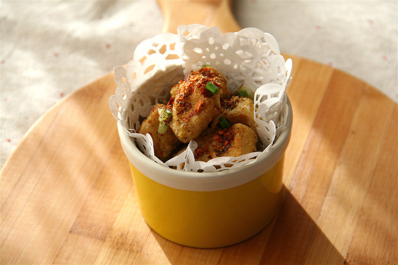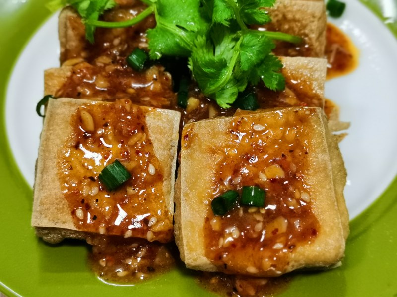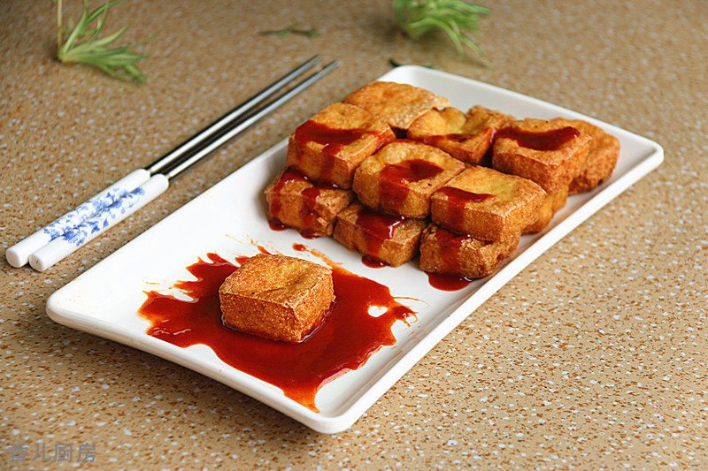 5:豆腐炸好了出锅装盘,沾上酱料吃,生抽本身咸不需要再加盐了。这个酱料可以拌冷菜海带丝啥的,也很赞哦。豆腐的香脆加上酱料的鲜味口感很好。大家对酱料有疑惑的可以咨询我哦
