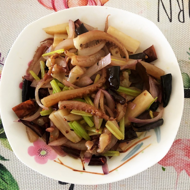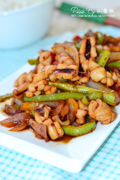 5:中火煸炒几分钟,待到魷鱼发白微卷时