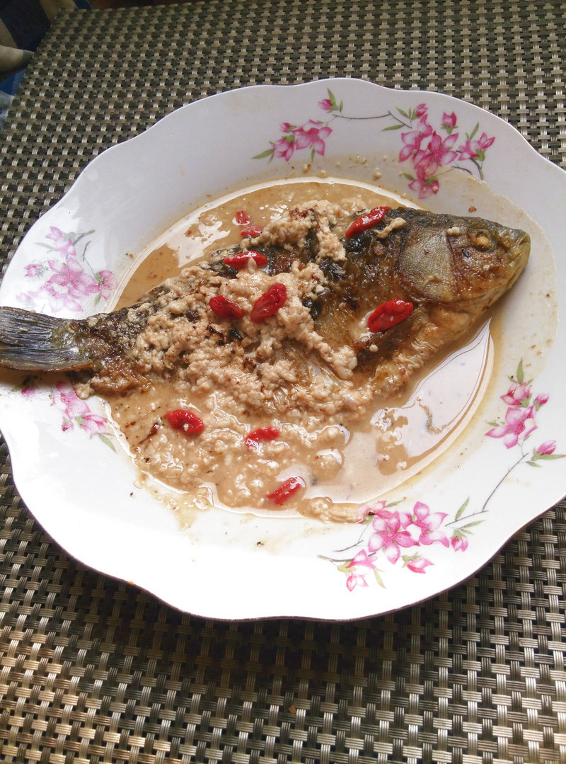 3:油煎鲫鱼,两面煎黄,加水煮,加盐,香糟。