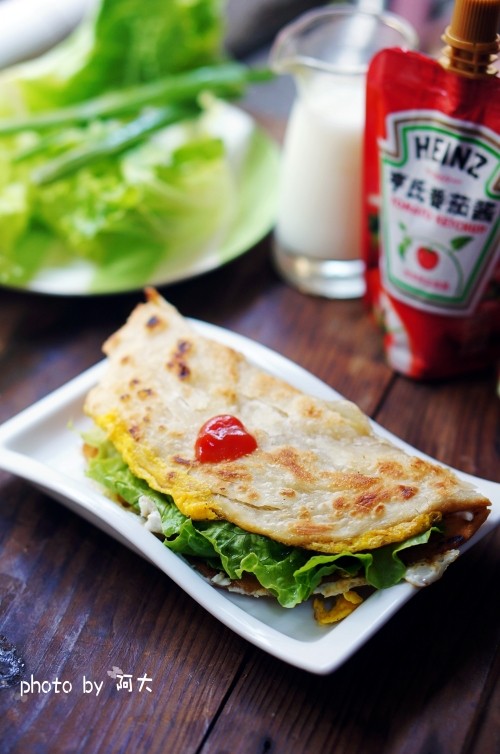 18:铺上生菜叶和煎过的火腿肠,再加拌面酱和番茄酱,夹起来就可以吃咯!