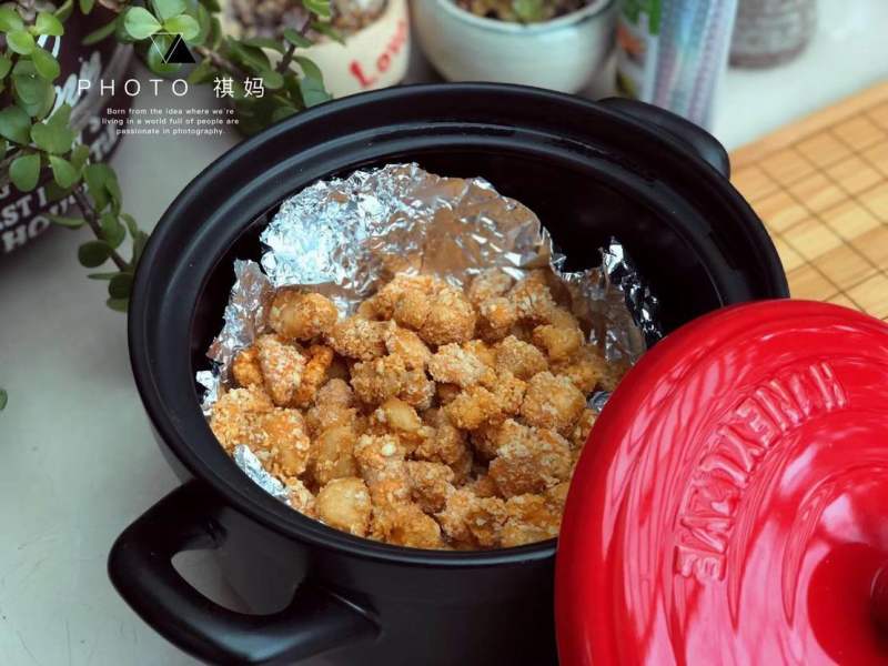注意事项:一般的砂锅是不能用来这样干烧烘烤鸡米花的。我用的是干烧急冷都不破的黑乐砂锅,所以没问题。