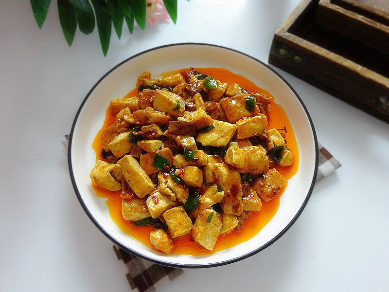 1:锅内放油把豆腐煎微黄加一勺郫县豆瓣翻炒。