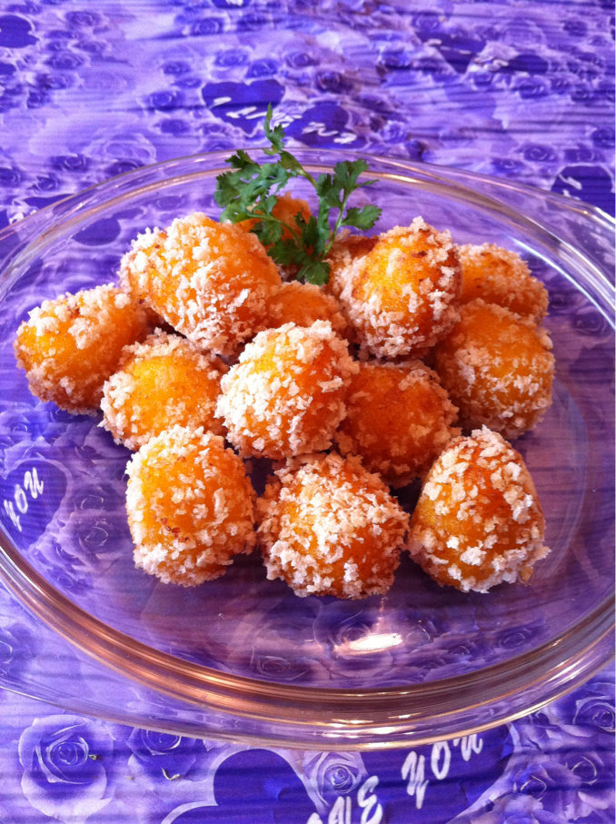 5:在面包糠里滚一下让糯米丸均匀裹上面包糠