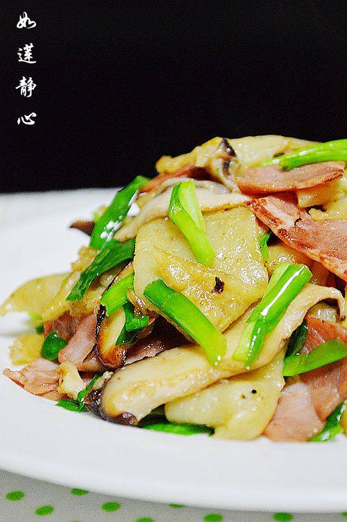 7:锅里放适量油,放火腿片煎至两面黄。