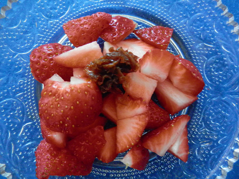 5:再加入少许纯净水后,把草莓浸泡在糖水里,水不要太多,刚浸没草莓就好